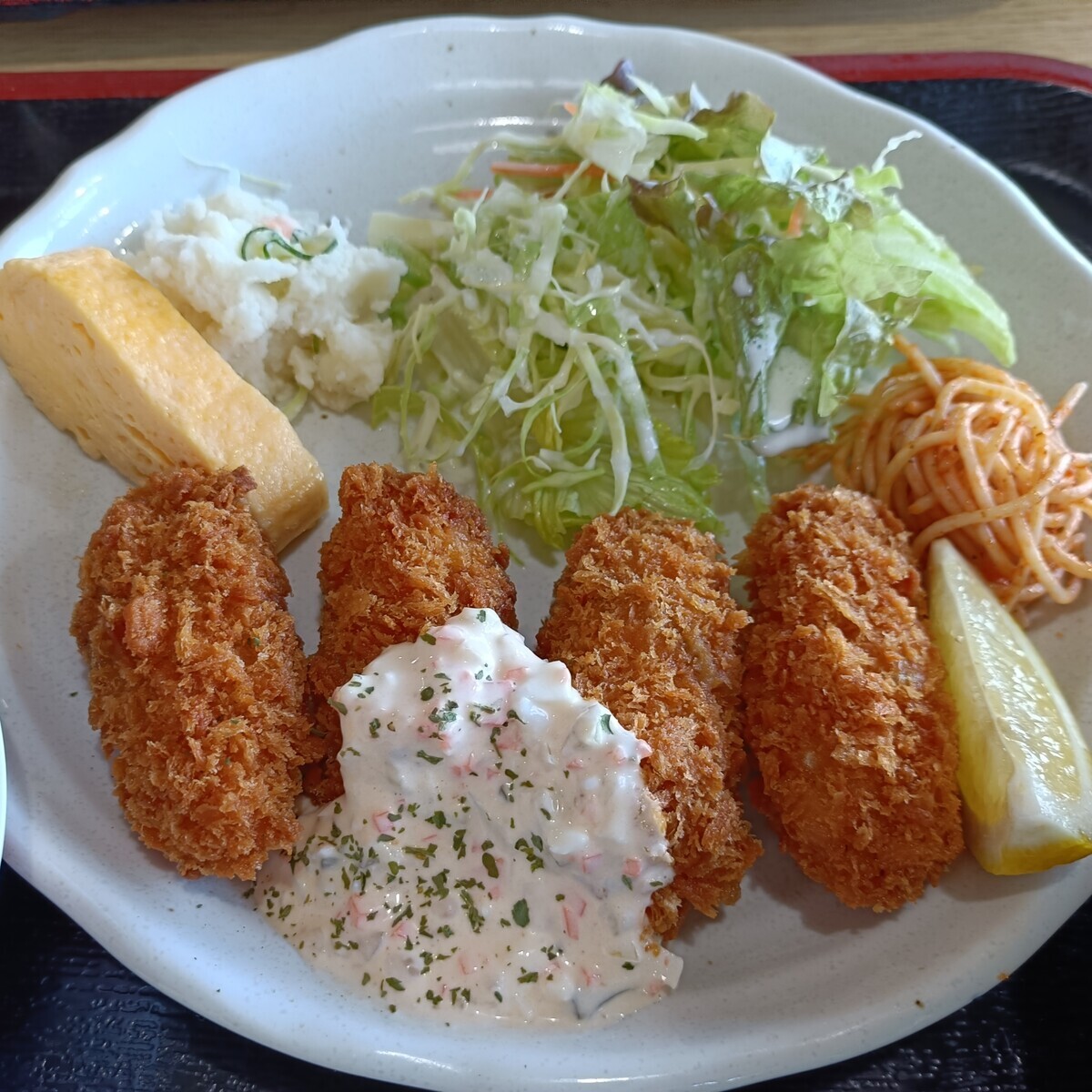 今日は代休。妻も休みだったので二人で買い物。お昼は最近気にいっている近所の定食屋へ。カキフライ定食。具沢山お味噌汁、付け合わせのスパゲティがしっかり美味しい。手作りのタルタルソースも丁寧な作りでいいね。食後にコーヒー飲めるのが嬉しい。